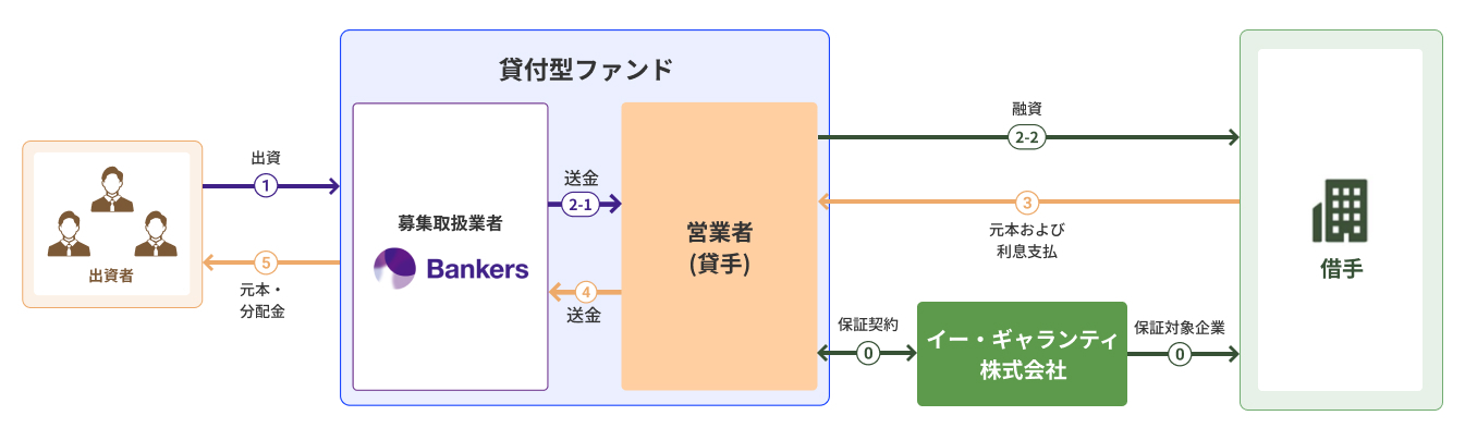 借手が破綻した場合、本融資は無担保のため、本融資債権の全額を回収することが困難になる可能性がございますが、営業者は、イー・ギャランティ株式会社(以下「保証会社」といいます。)と保証契約を締結し、以下のような事由が発生した場合、保証履行事由に該当したものとして保証会社へ保証履行を求めます。