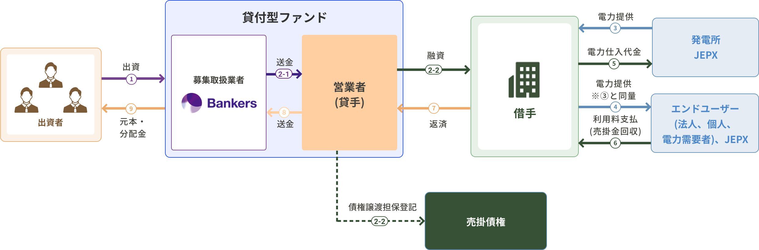 元本の毀損リスクや、元本償還の時期が遅れるリスクの原因としては、卸電力市場や金融市場の変動などの影響が考えられます。また営業者と金銭消費貸借契約を締結する借手において、財務状況や支払能力が悪化した場合なども、同じくお客様の元本毀損リスクに影響する可能性があります。