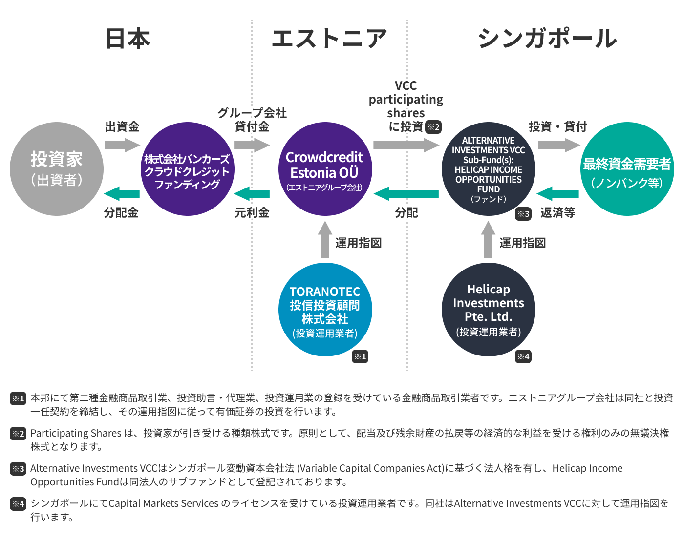 なお、以下、営業者を貸手、運営者を借手とする貸付宛貸付契契約を「運営者宛貸付契約」、運営者は、営業者からの運営者宛貸付契約に基づく融資金を原資として、運営者が投資一任契約を締結しているTORANOTEC 投信投資顧問株式会社(以下「投資運用業者」といいます。)による運用指図に基づき、シンガポールの投資運用業者であるHelicap社 が運用するプライベート・クレジット・ファンドである「Helicapファンド」への投資(以下「Helicap投資」といいます。)を行います。
