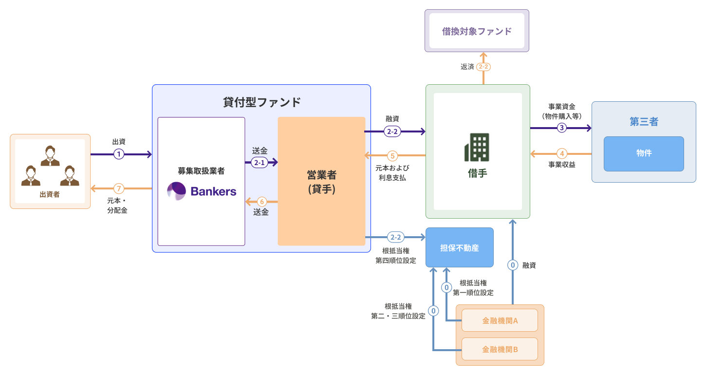 ・営業者の複数のファンドを原資として営業者が同一の借手に融資を行う場合、設定する担保の選定や条件、担保権の実行等に関する判断は、営業者が善良なる管理者の注意義務をもって行います。また営業者の複数のファンドから営業者が同一の借手の一般財産を対象に回収を実行する場合は、期限が到来している全ての融資債権を対象に等しく権利を行使し、回収結果は各ファンドを原資とする融資債権の元本額に応じて配分します。