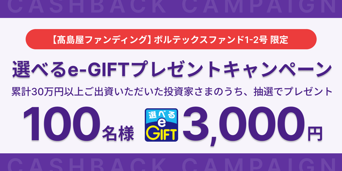本ファンドに累計30万円 以上ご出資いただいた投資家さまのうち、抽選で100名様に選べるe-GIFT3,000円をプレゼント いたします!