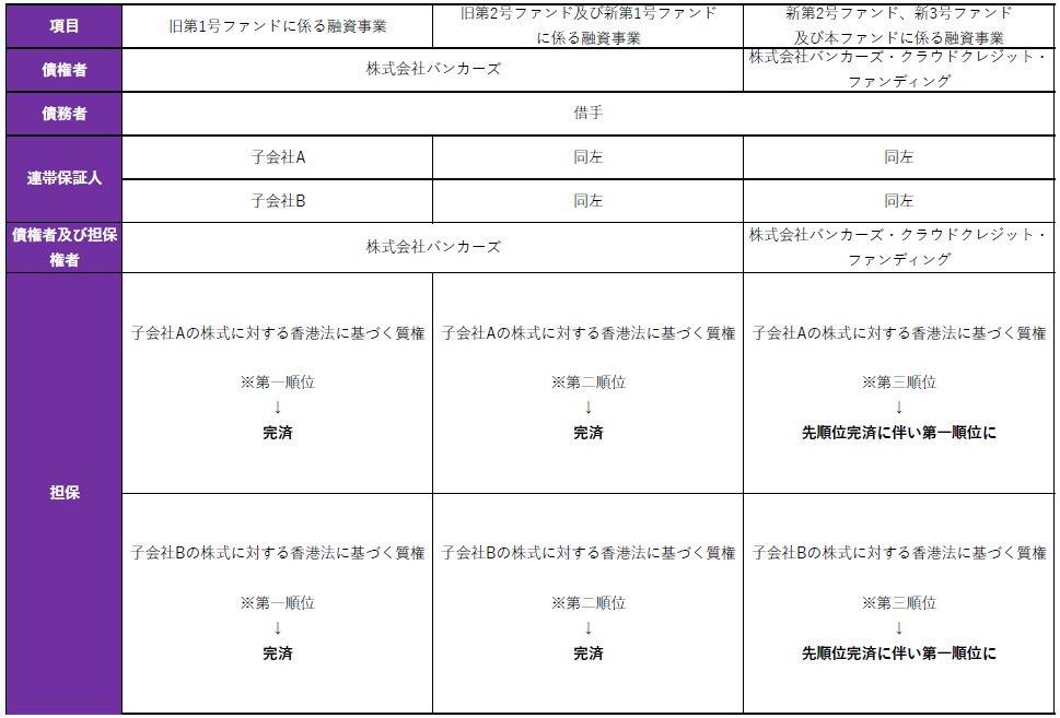 本ファンドシリーズでは、過去に株式会社バンカーズを債権者とする貸出を行っており、借手子会社2社の株式に対し旧第1号ファンドが第1順位の質権を、旧第2号&新第1号ファンドが第2順位の質権を、新第2号ファンドが第3順位の質権を設定しておりました。