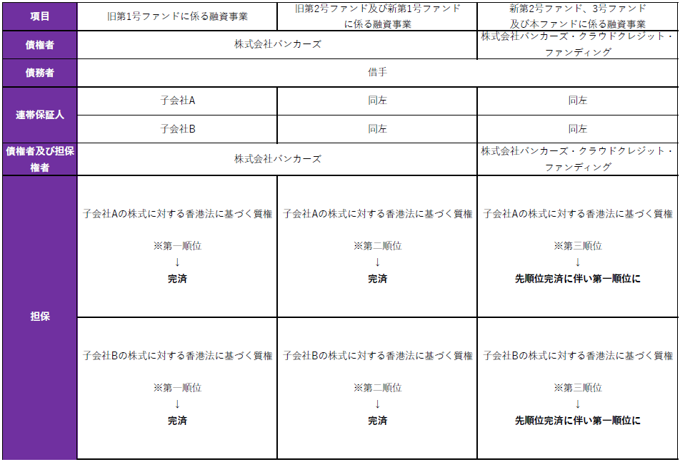 本ファンドシリーズでは、過去に株式会社バンカーズを債権者とする貸出を行っており、借手子会社2社の株式に対し旧第1号ファンドが第1順位の質権を、旧第2号&新第1号ファンドが第2順位の質権を、新第2号ファンドが第3順位の質権を設定しておりました。