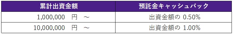 本ファンドに累計100万円以上ご出資いただいた投資家さまに、以下の通り預託金口座にキャッシュバックいたします!