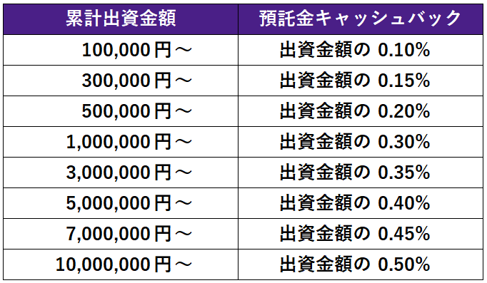キャンペーン対象ファンドのうち、1ファンドにつき10万円以上(※)ご出資いただいた投資家さまに以下の通り預託金口座にキャッシュバックいたします!