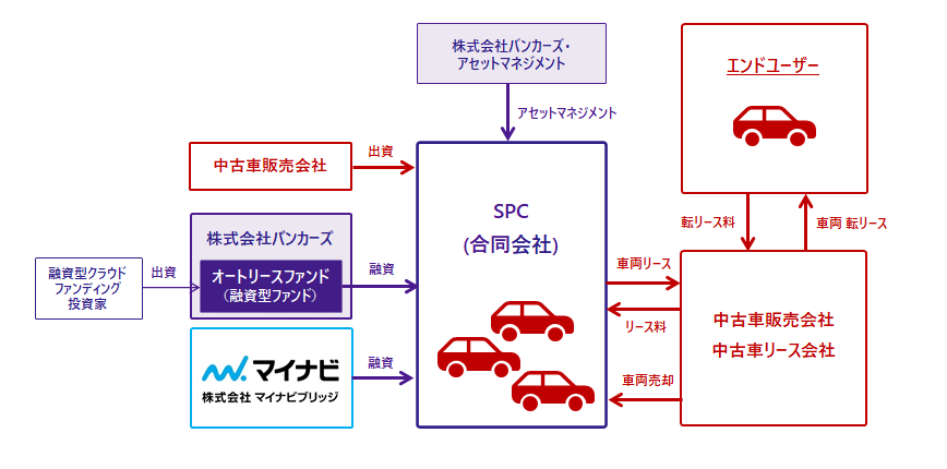 バンカーズの融資型ファンドおよびマイナビブリッジは、SPCによる中古車購入資金を資金使途として、SPCへ協調融資を行います。本スキームでは、リース料の回収率向上および貸倒率の抑制に資する、車両の監視と機能の一部制御が可能なIoTデバイスを、リース車両の大半に搭載したうえで、リース料債権を担保とする保全措置をとっております。また、中古車販売事業者自身がSPCへ一部出資を行うことで、万一エンドユーザーが支払不能に陥った場合や、SPCが購入する中古車両の数が想定よりも少なくなった等、貸倒れや収益下振れが発生した場合についても、一定割合を中古車販売事業者自身が事業リスクとして負う保全スキームを採用することで、投資家のみなさまから資金を募集するにふさわしい融資型ファンド商品に仕立てることができたと考えます。なお、アセットマネジメント業務は、バンカーズグループの株式会社バンカーズ・アセットマネジメントが担います。