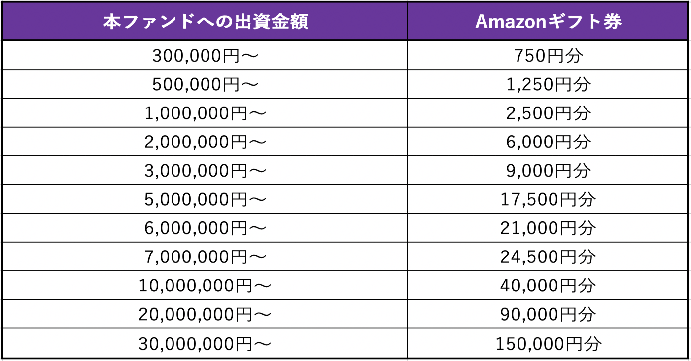 なお、本ファンドは上期最後の募集ファンドとなります。投資家のみなさまへ、日頃のご愛顧への感謝と、下期も引き続きBankersをよろしくお願いしますという思いを込め、本ファンド限定のキャンペーンをご用意させていただきました。「売掛債権早期資金化事業支援ファンド第1号」への出資金額に応じて、下記の通りAmazonギフト券をプレゼントいたします!