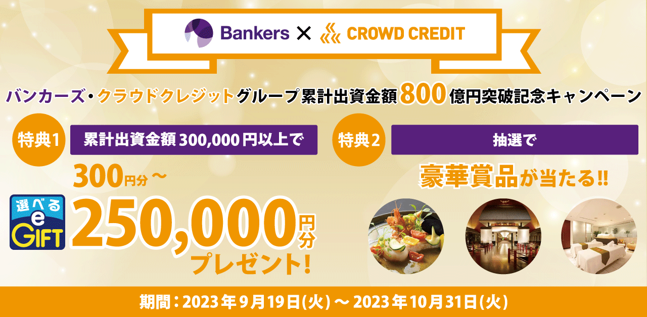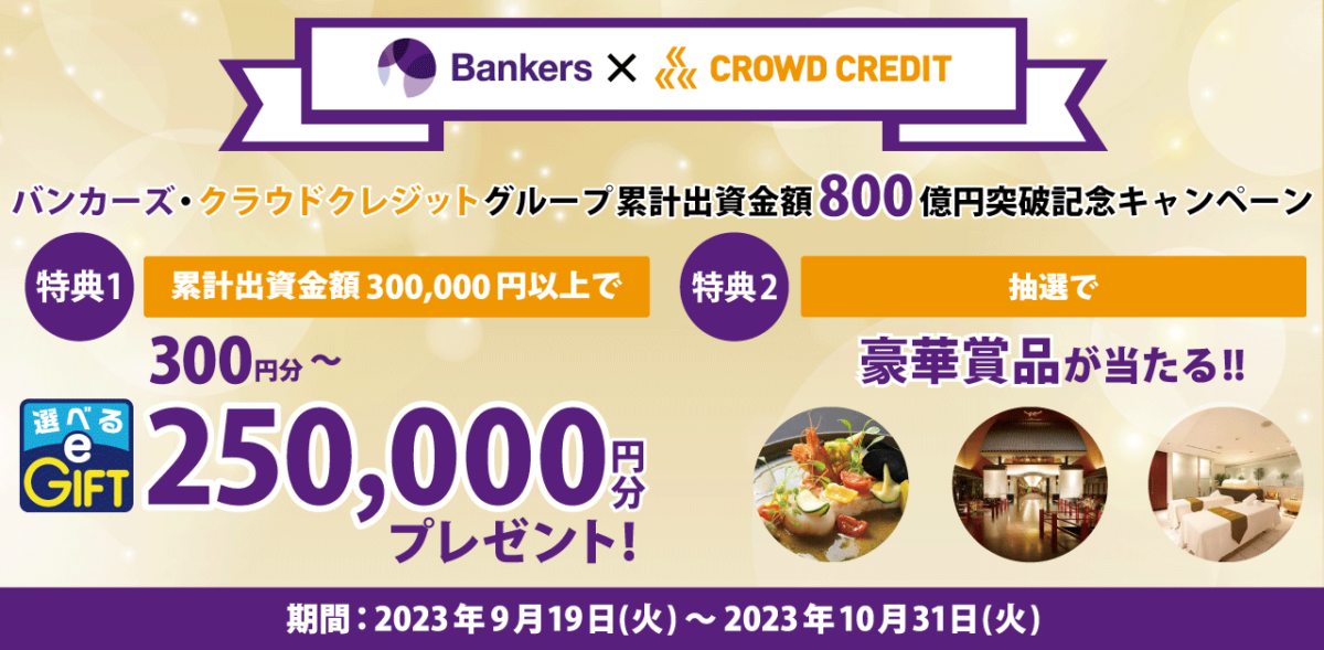 今回を記念して、バンカーズとクラウドクレジットでは共同で「バンカーズ・クラウドクレジット グループ累計出資金額800億円突破記念キャンペーン」を2023年9月19日より開催しております。