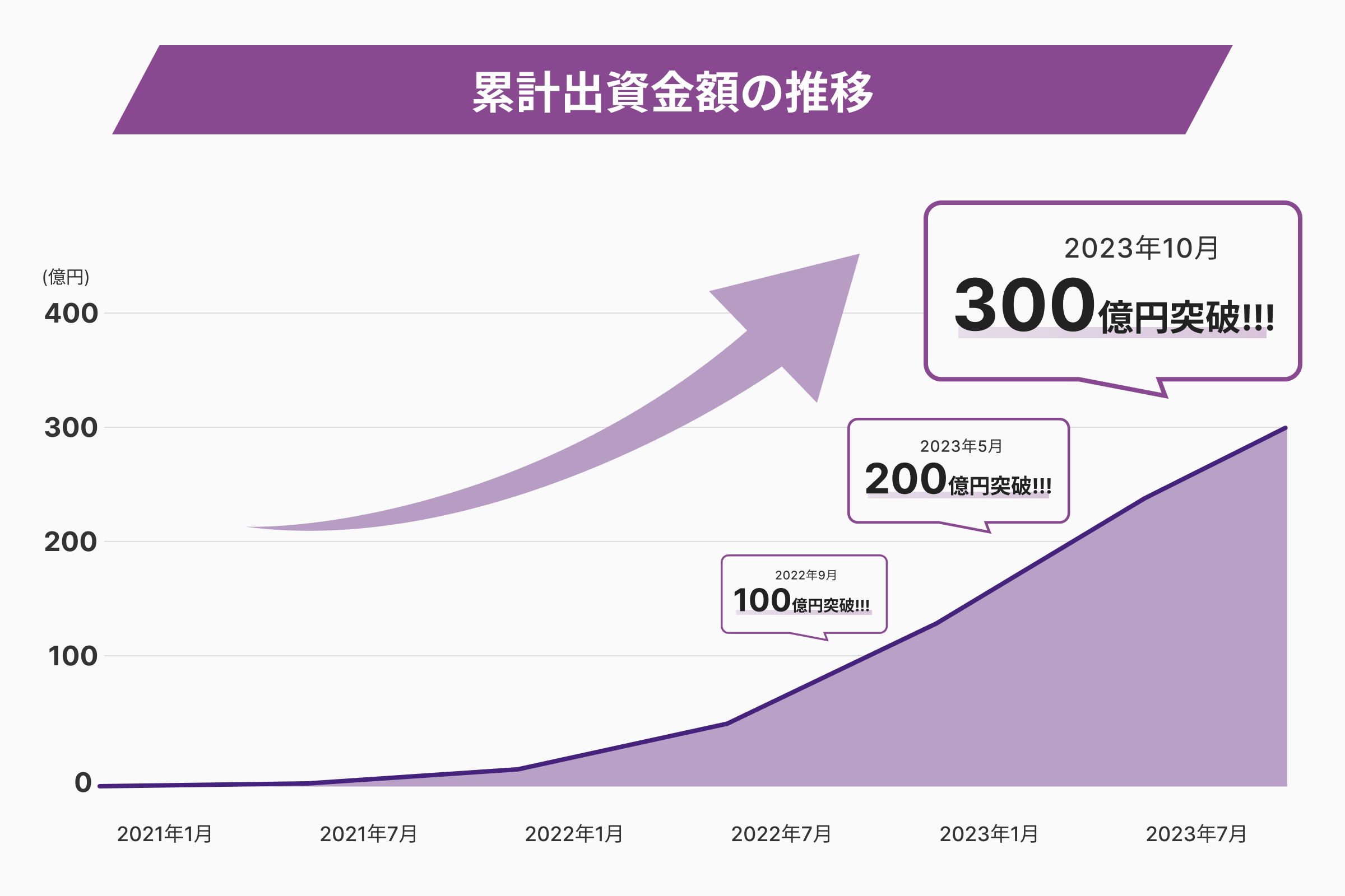 200億円突破からおよそ6か月の2023年10月現在までに、バンカーズでは初の海外企業を直接の貸付先とする案件をはじめとした80を超えるファンドを募集し、開業から3年を目前にして募集したファンド総数は240を突破、みなさまからの累計出資金額も業界最速*で300億円に到達いたしました。