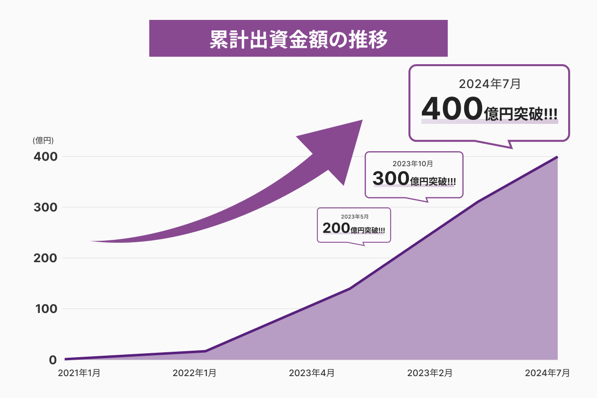 バンカーズは2020年12月のサービス開始以降、多くの投資家のみなさまの支えのもと、22か月で100億円、30か月で200億円、35ヶ月で300億円と、常に業界最速**で累計出資金額を更新してまいりました。