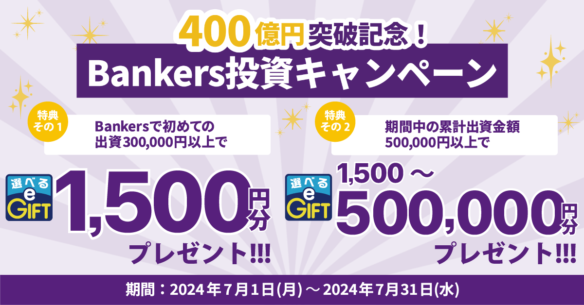 400億突破を記念して、2024年7月1日(月)から2024年7月31日(水)の期間中、投資家のみなさまへの感謝を込めて「400億突破記念!Bankers投資キャンペーン」を実施します。